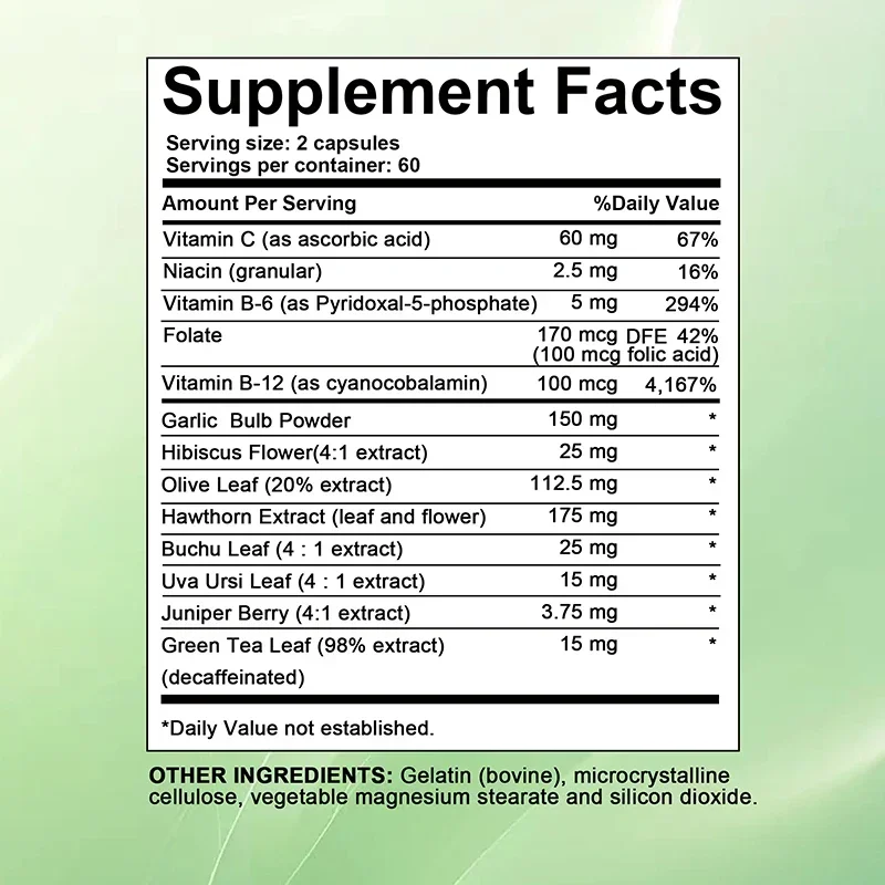 All-in-One Formula: Experience the many nutrients in our blood pressure supplement, including hawthorn berry, hibiscus, garlic extract, olive leaf, buchu leaf, bearberry, juniper berry, green tea, vitamin C, niacin, vitamin B6, folic acid, and vitamin B12.
