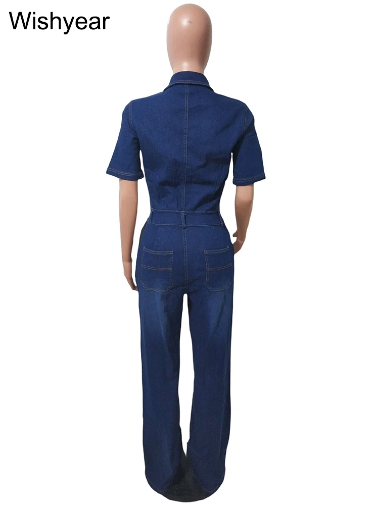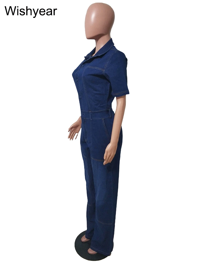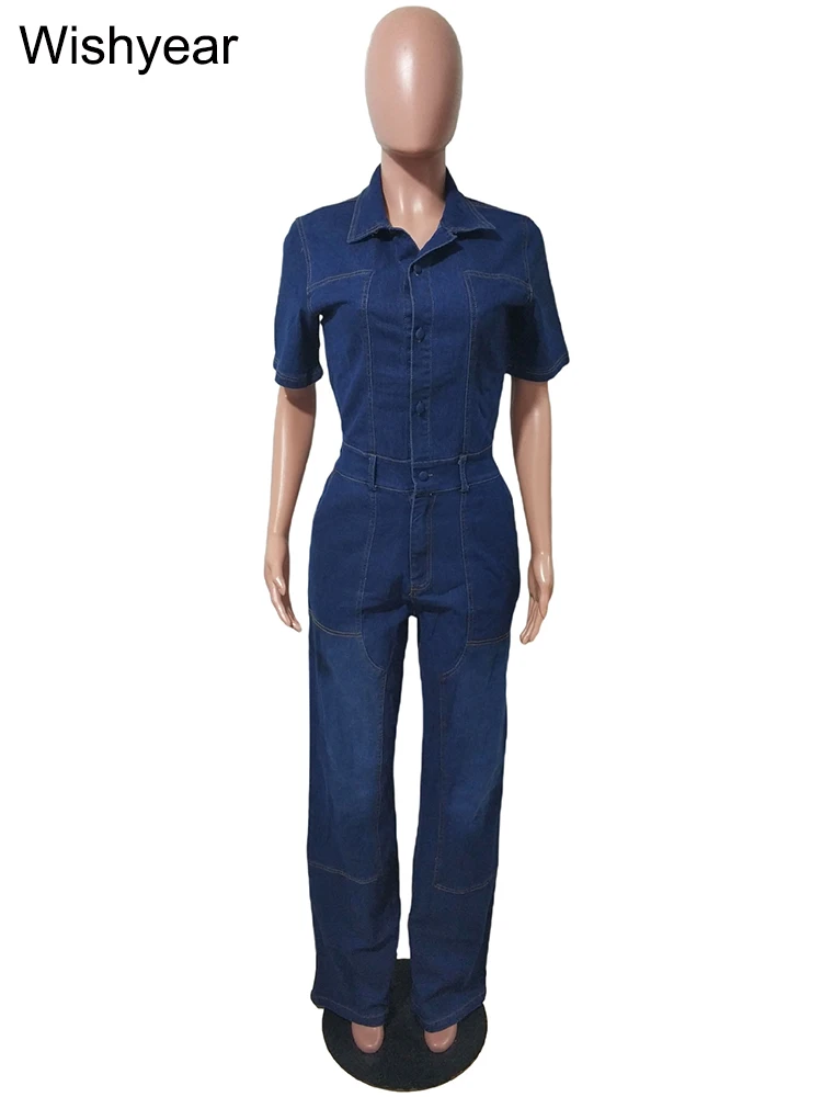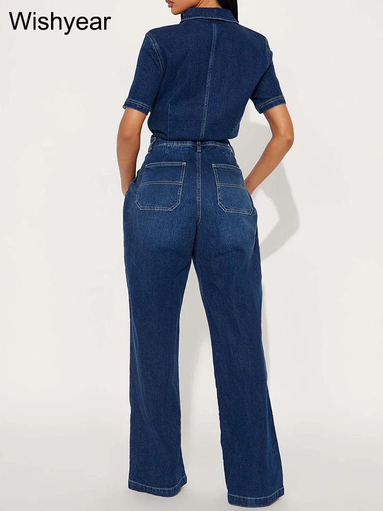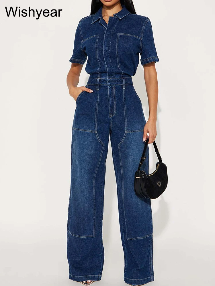 Blue Stretch Denim Jumpsuit for Women Pocket Short Sleele Lapel Cargo Pants Rompers Female Spring Fall Streetwear Wide Leg