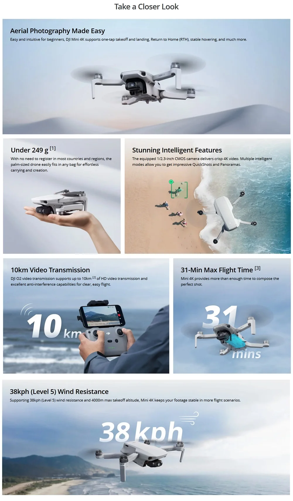 Easy and intuitive for beginners, DJI Mini 4K supports one-tap takeoff and landing, Return to Home (RTH), stable hovering, and much more.