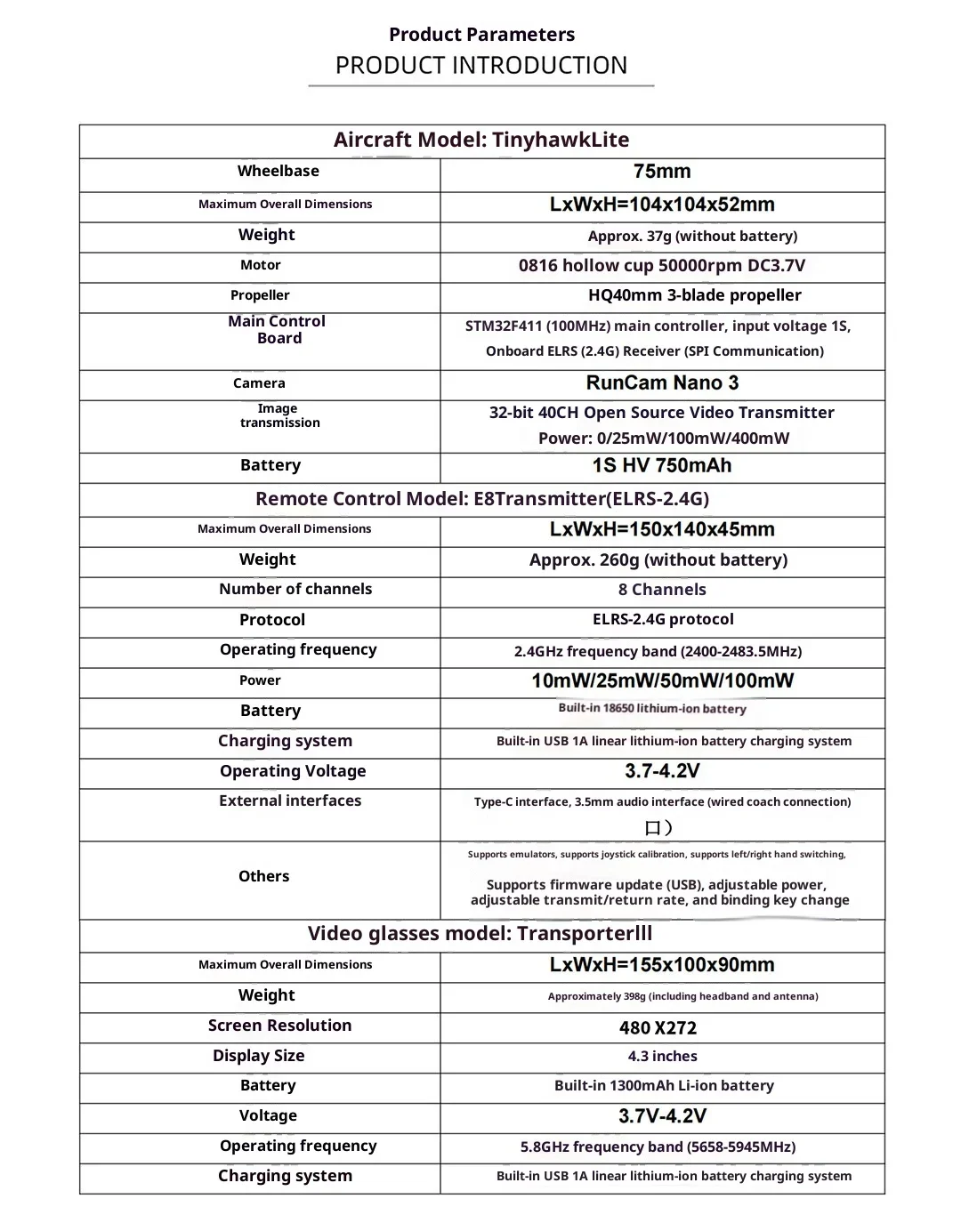 Paired with an E8 2.4G ELRS protocol remote control, providing ample control distance and switchable between left and right hands. 8 channels, adjustable power 10mW/25mW/50mW/100mW, and compatible with simulators.