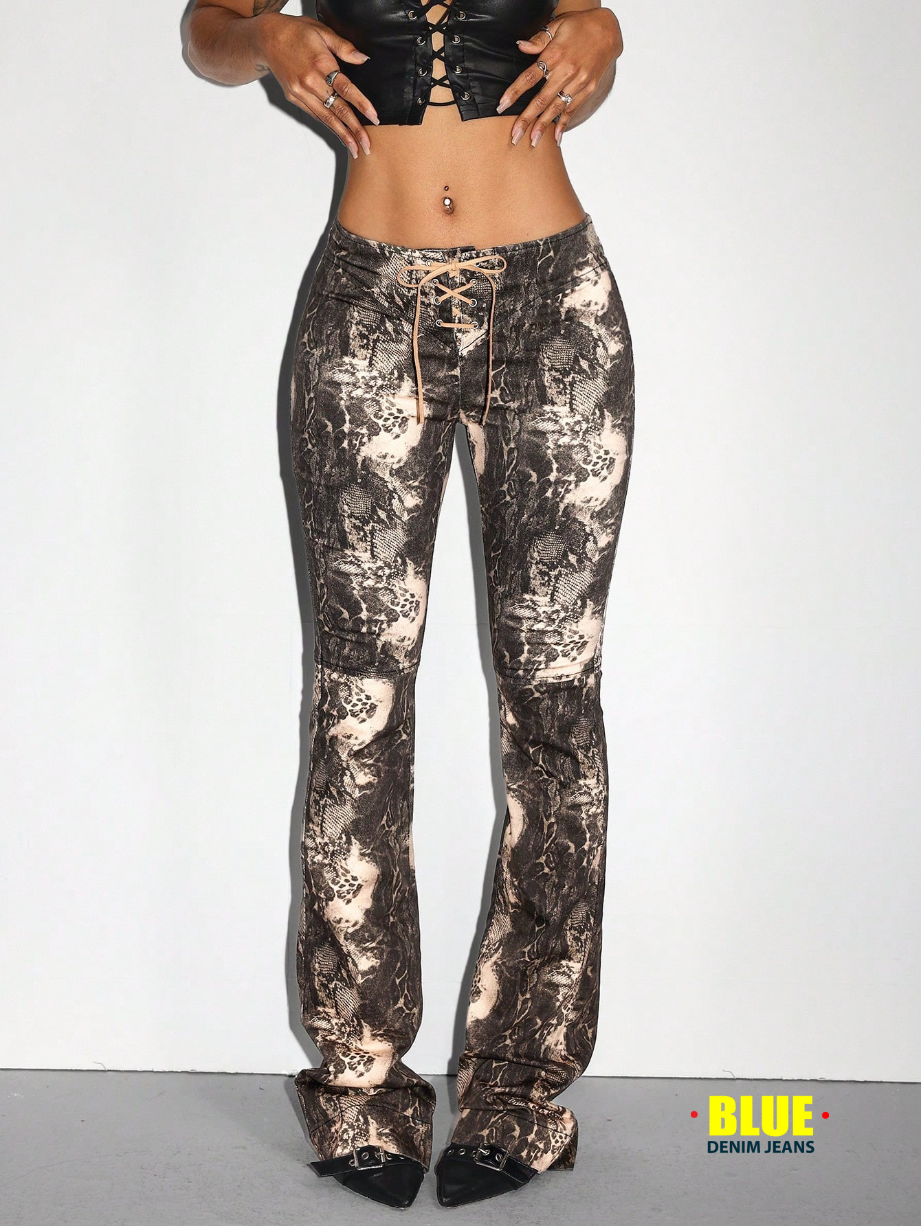 The jeans feature a dramatic flare leg, an ultra-low waist, and practical details like a button, pocket, and zipper.