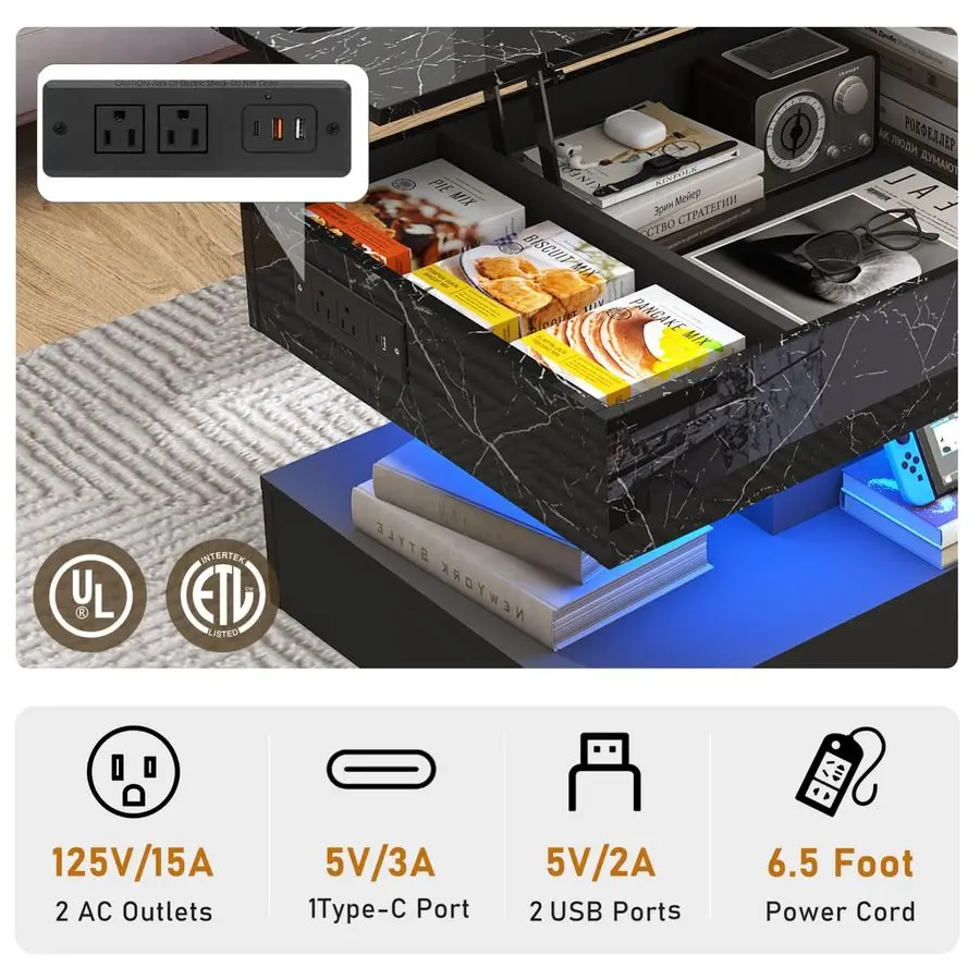 47.2 Inch Large LiftTop Coffee Table Our lift top LED coffee table experiences smooth and safe lifting with a premium lifting mechanism featuring gas struts. It lifted to 22.6 inches in height for convenient office work. When the lifting top is closed, 2tier appearance and a classic and beautiful marble finish create a simple and generous style. It can be a daily modern coffee table, as well as a gaming coffee table or workstation.