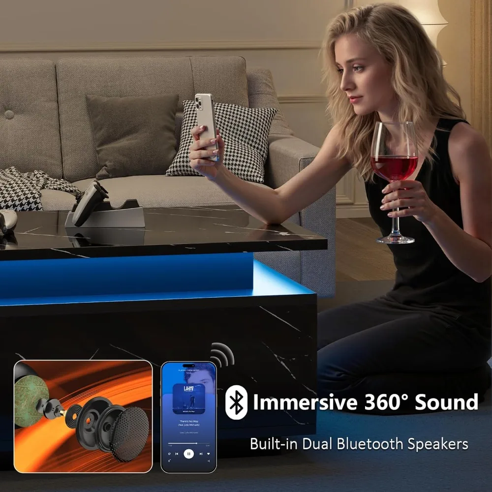 - 【APP Connectivity】Our coffee table comes with a speaker. It can connect to your smartphone, tablet, or other app control devices, allowing you to enjoy music, podcasts, or other media content anytime, anywhere. The 2-in-1 modern coffee table is versatile and can also be used as a sofa table, cocktail table, or office desk. Its simple design is perfect for your office, bedroom, or living room