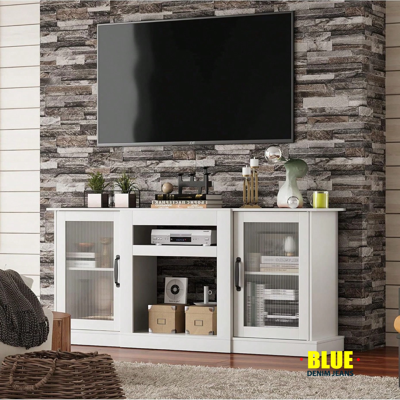 LocalTV Stand For 65-Inch TV, Retro TV Console Cabinet With Storage And Open Shelves, Entertainment Center For Living Room, Bedroom, White