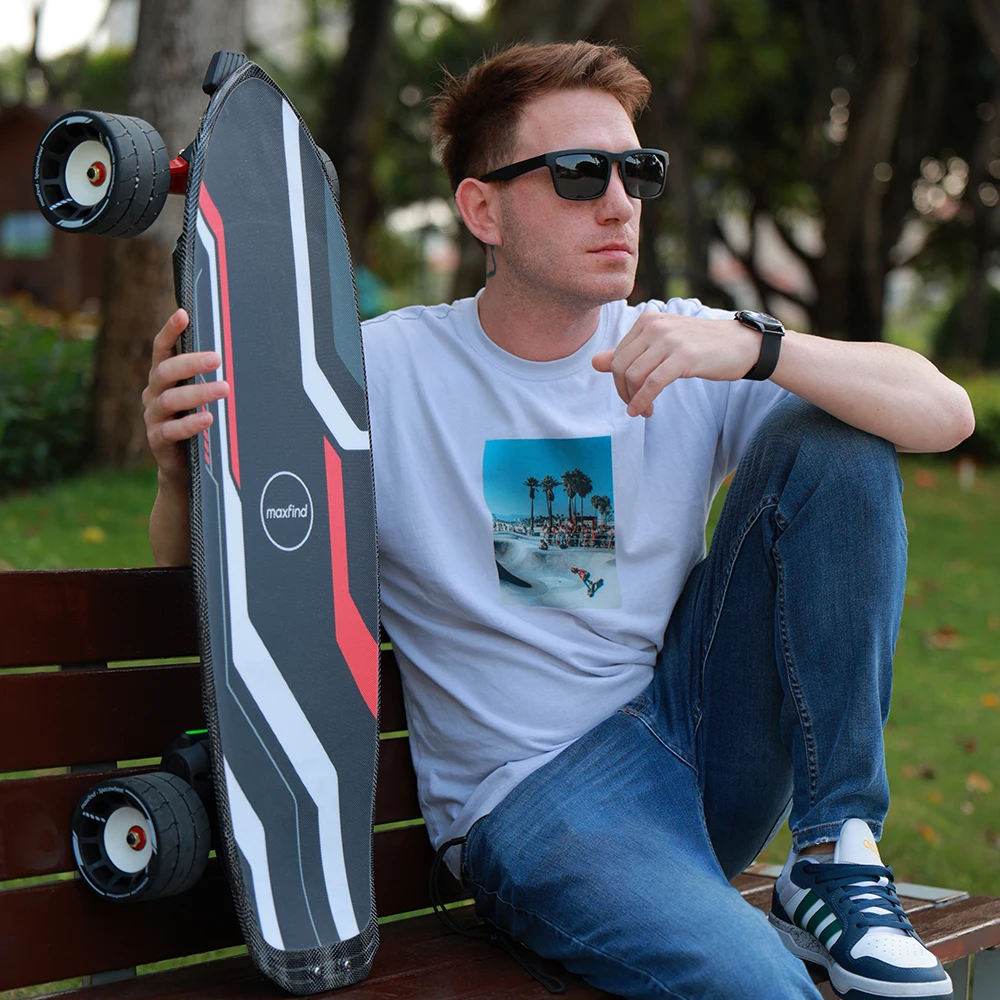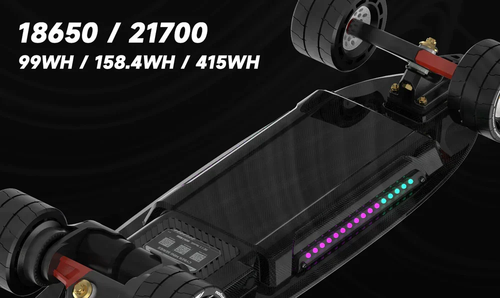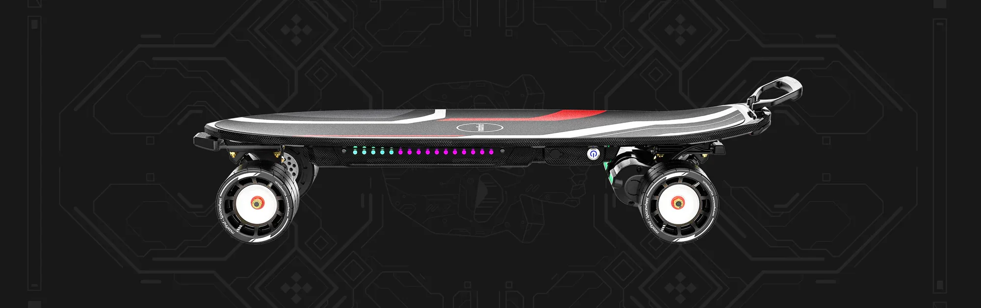 The CYBER MINI series electric skateboard features a 32-inch U-shaped concave deck with a 7mm footwell, ensuring stability on any terrain. Its cyberpunk-inspired design blends futuristic style with advanced performance