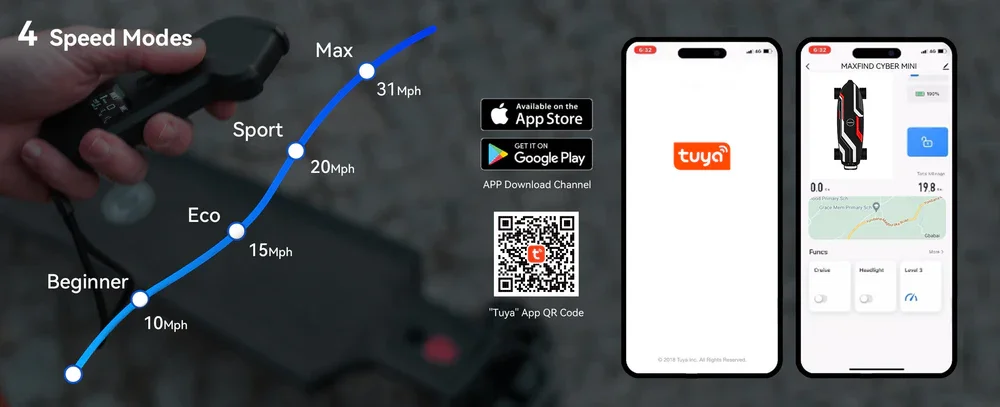 Featuring newly upgraded dual 900W belt-driven motors, the CYBER MINI stands as the best and fastest electric skateboard, reaching a top speed of 31 mph (50 km/h). Experience superior acceleration, smooth performance, and industry-leading speed in a compact design.