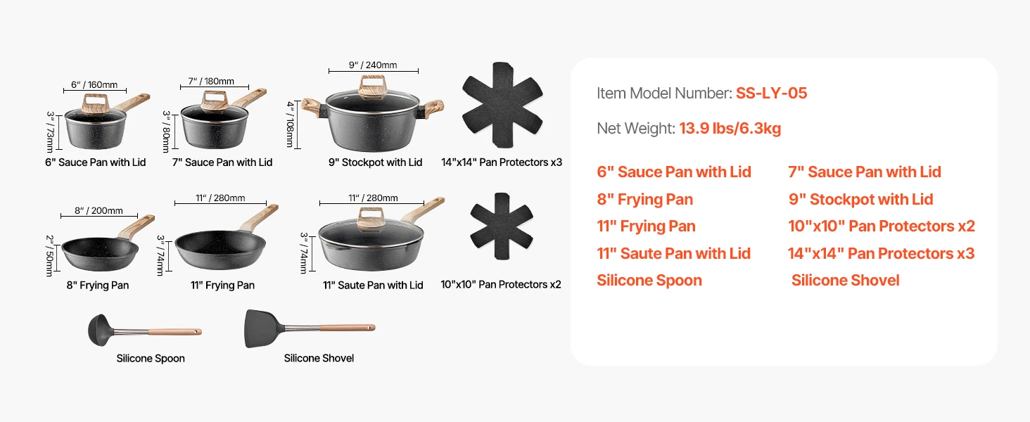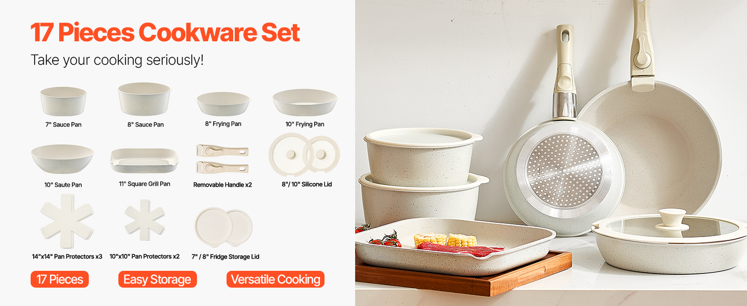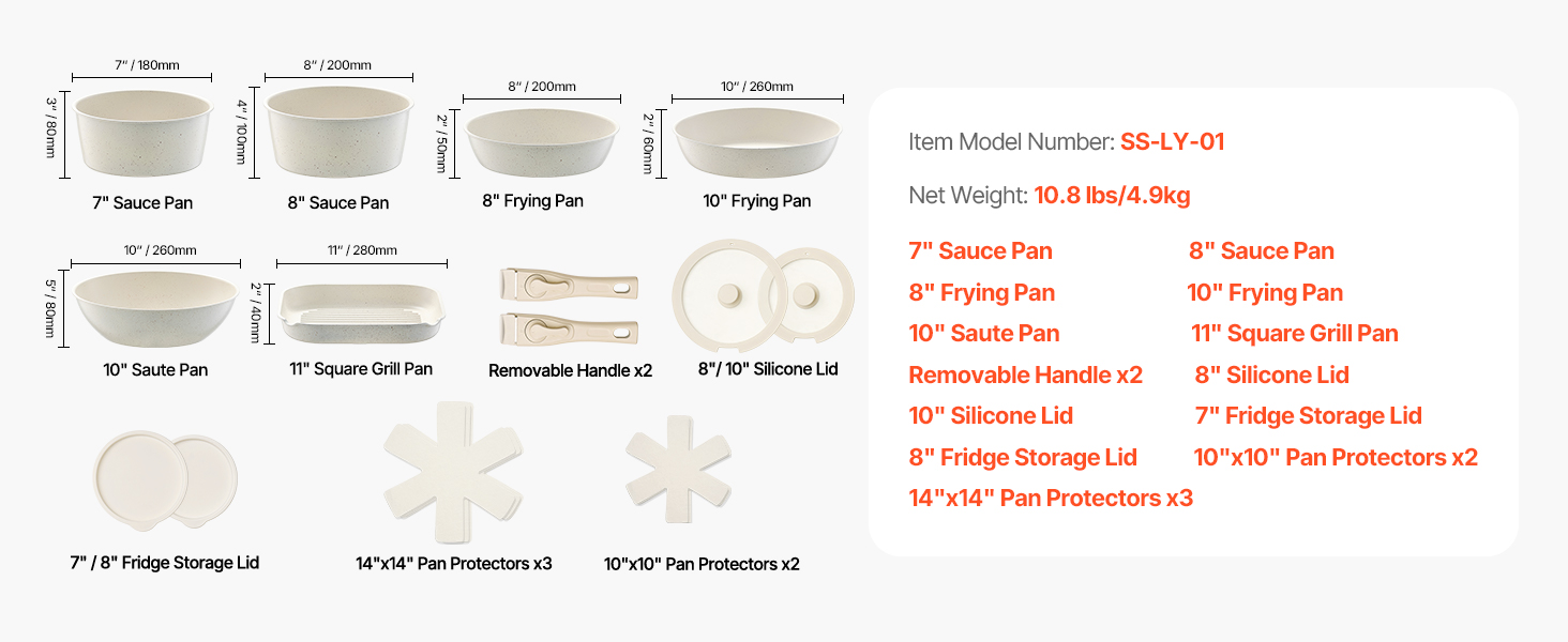 • 17-piece Cookware Set: A versatile pots and pans set that includes: 7in sauce pan, 8in sauce pan, 8in frying pan, 10in frying pan, 10in saute pan, 11in square grill pan, 2 removable handles, 8in silicone lid, 10in silicone lid, 7in fridge storage lid, 8in fridge storage lid, 2 10x10in pan protectors, and 3 14x14in pan protectors.