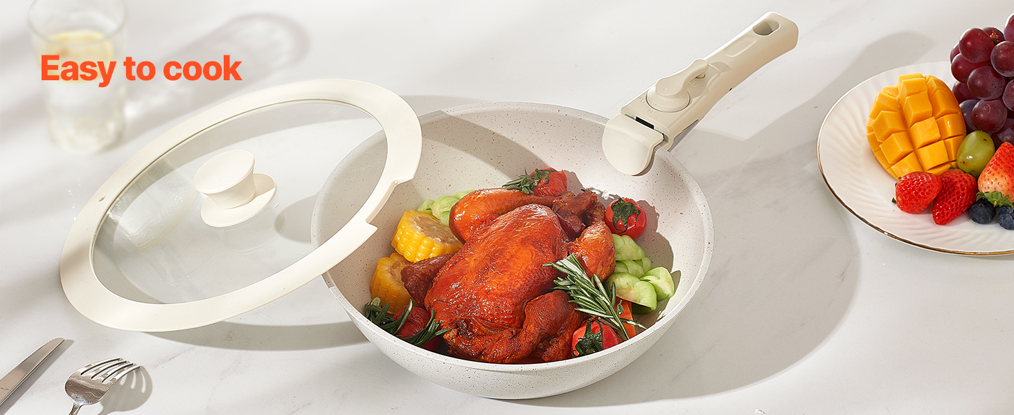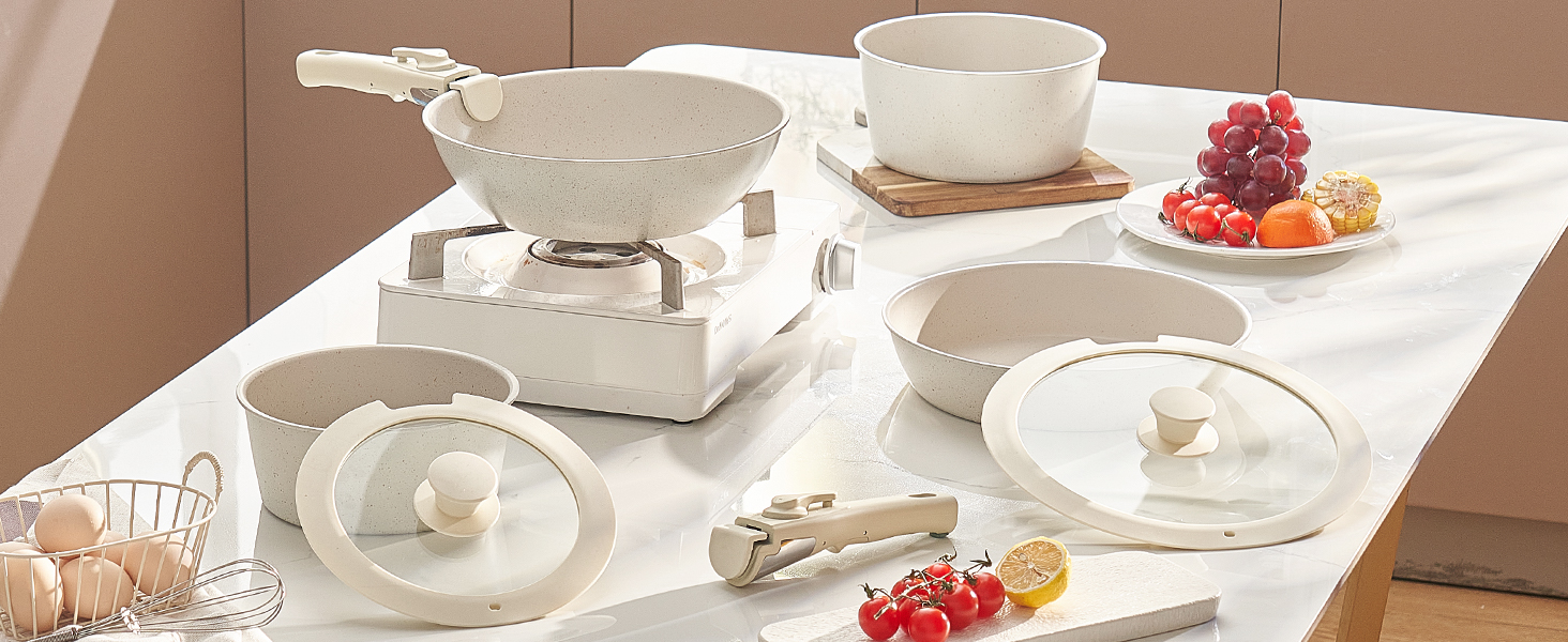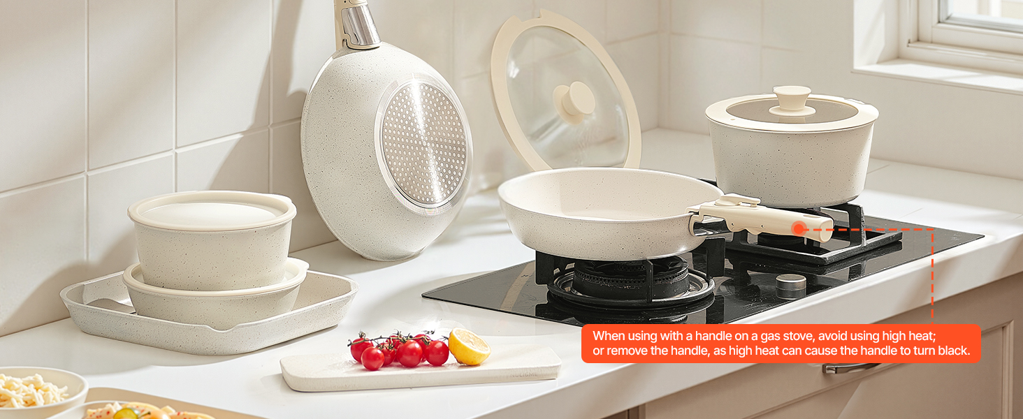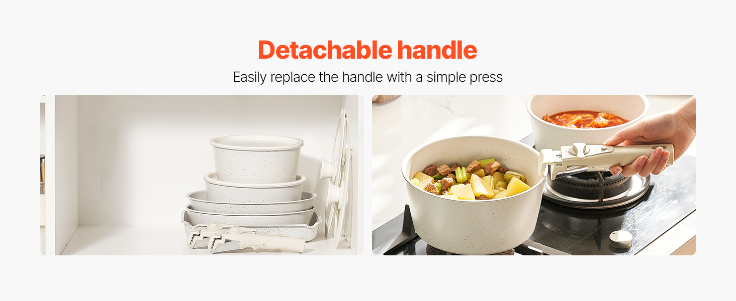 • Easy to Store: The cookware set is designed with a detachable handle system, allowing easy replacement with just one press. Removing the handles saves up to 70% storage space, making it convenient for stacking and compact storage in cabinets or RVs