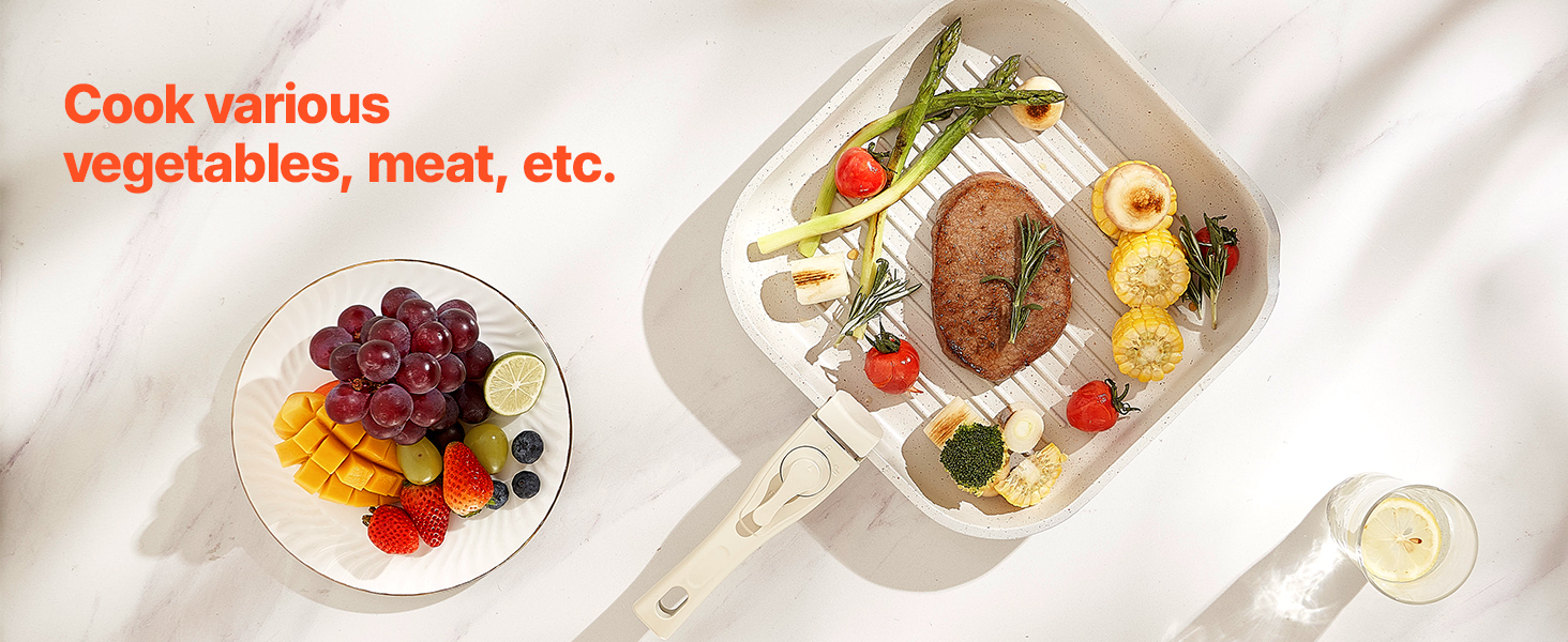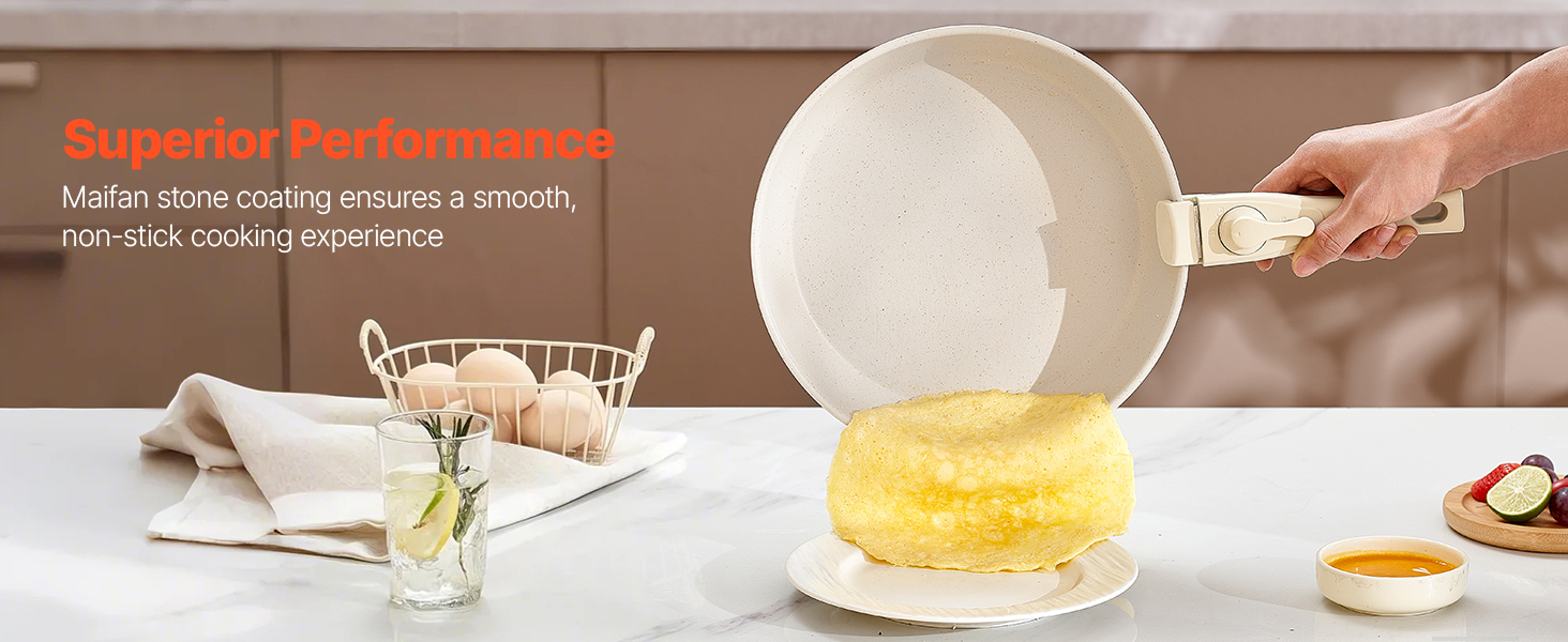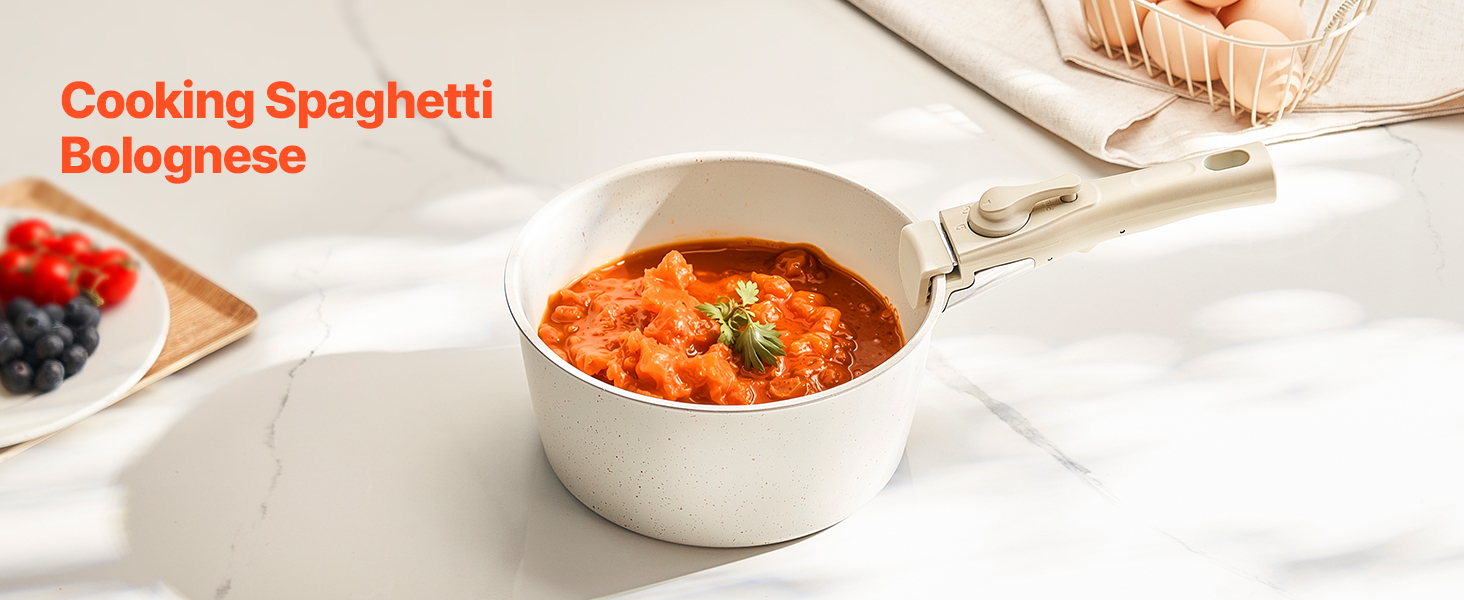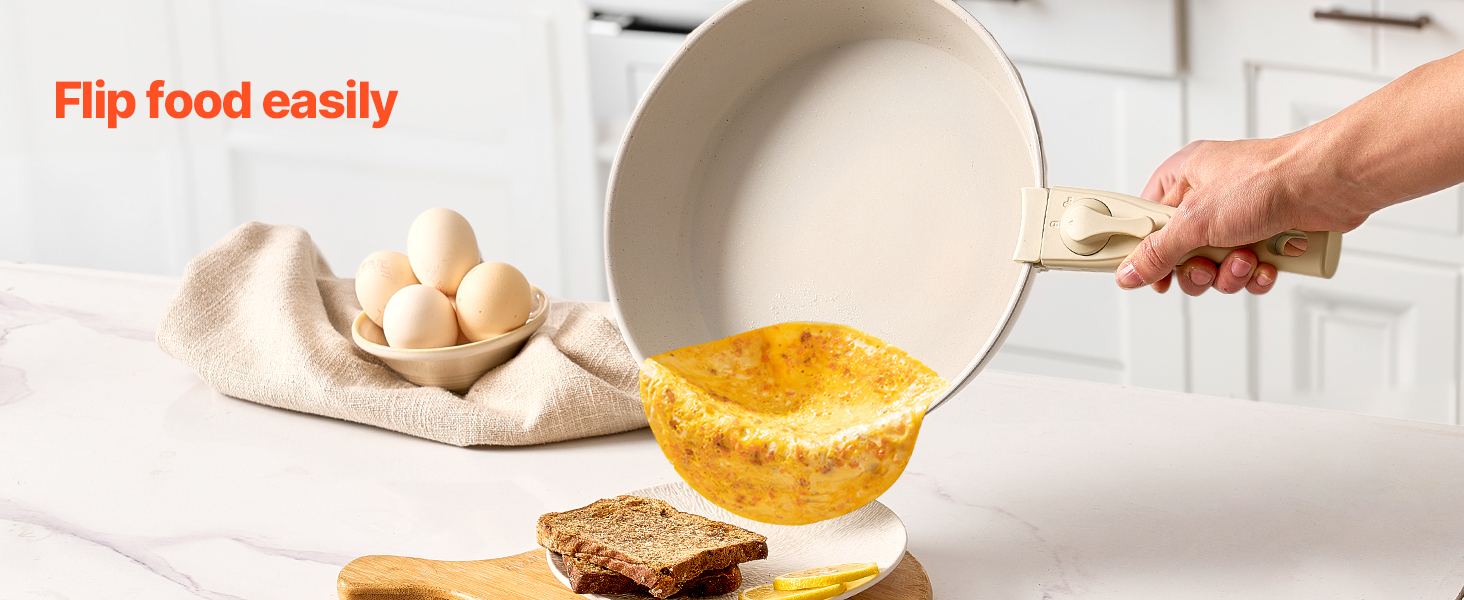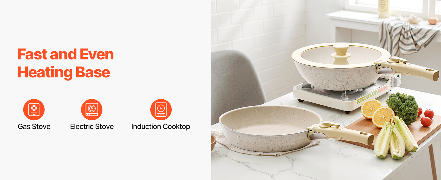 • Easy to Store: The cookware set is designed with a detachable handle system, allowing easy replacement with just one press. Removing the handles saves up to 70% storage space, making it convenient for stacking and compact storage in cabinets or RVs