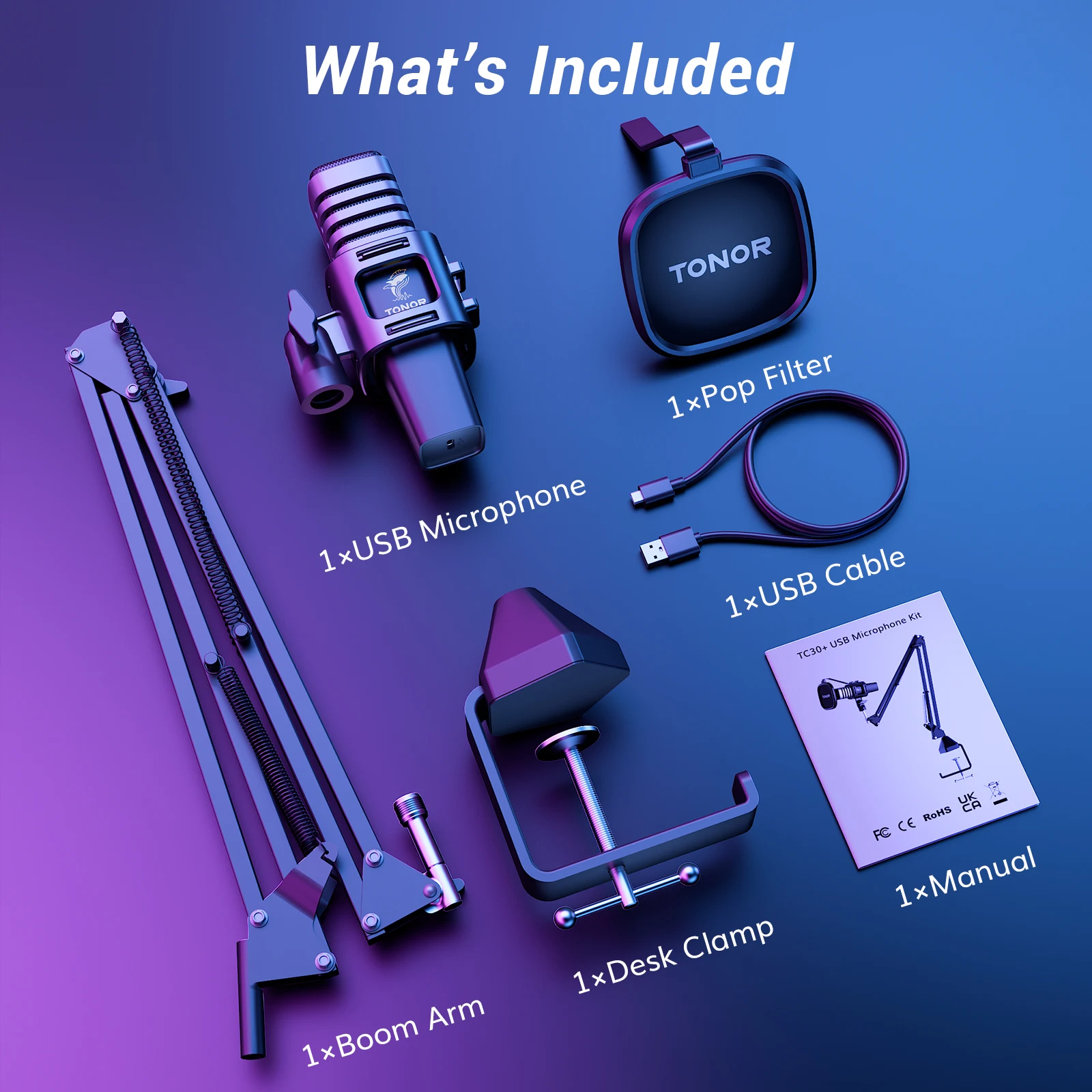 - Package includes: 1 x USB Condenser Microphone, 1 x Boom Arm, 1 x Desk Clamp, 1 x Shock Mount, 1 x Pop Filter, 1 x USB Cable, 1 x Manual.