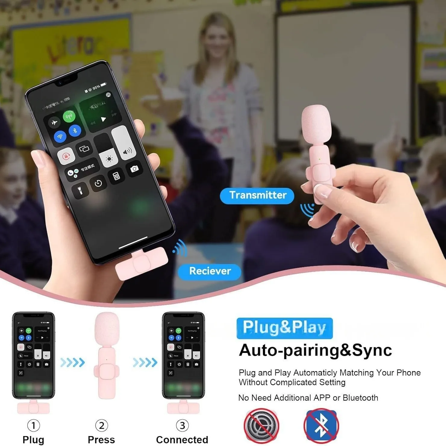 1. Easy Automatic Connection: This innovative wireless lav microphone is much easier to set. No Adapter, Bluetooth or Application needed. Just put the receiver into your devices (USB interface), then turn on the portable mic, these two parts will pair automatically