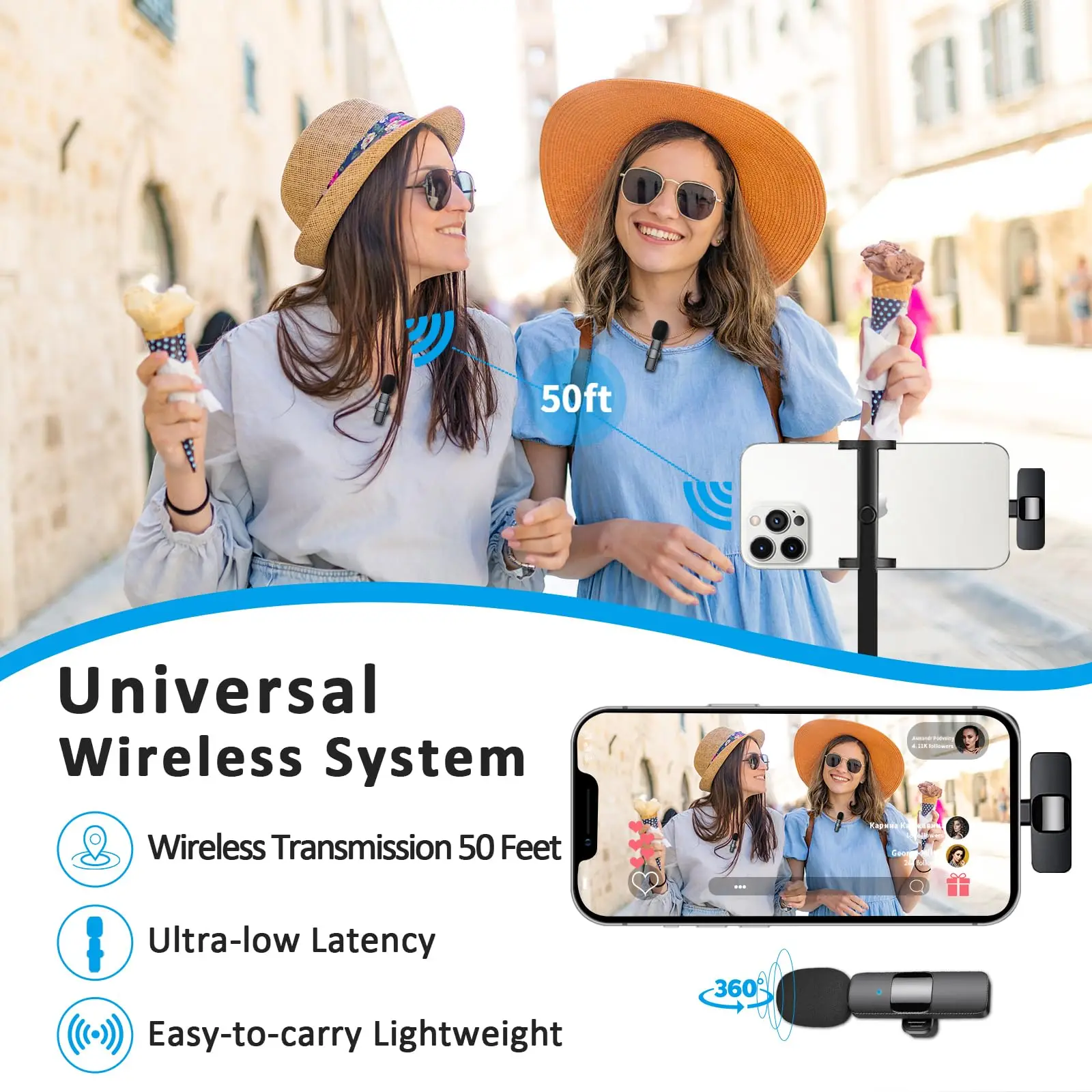 4. Universal Wireless System: The small lapel microphone is free of wire. You can hold it by hand or clip it on your shirt. Enable to cover 50ft for signal, helps you get rid of messy wire and clearly recording or taking video at a further distance indoors or outdoors.